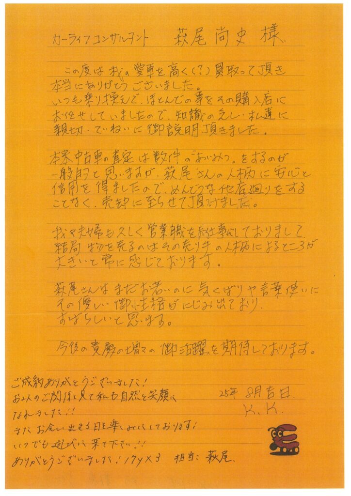 本来中古車の査定は数件の"あいみつ"をするのが一般的と思いますが、萩尾さんの人柄に安心と信用を得ましたので、めんどうな他店廻りをすることなく、売却に至らせて頂けました。