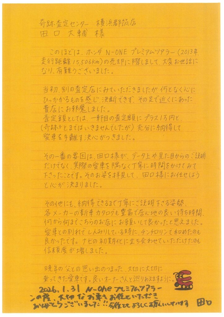このほどは、ホンダN-ONEプレミアムツアラー(2013年、走行距離15,506km)の売却に際しまして、大変お世話になり、有難うございました。