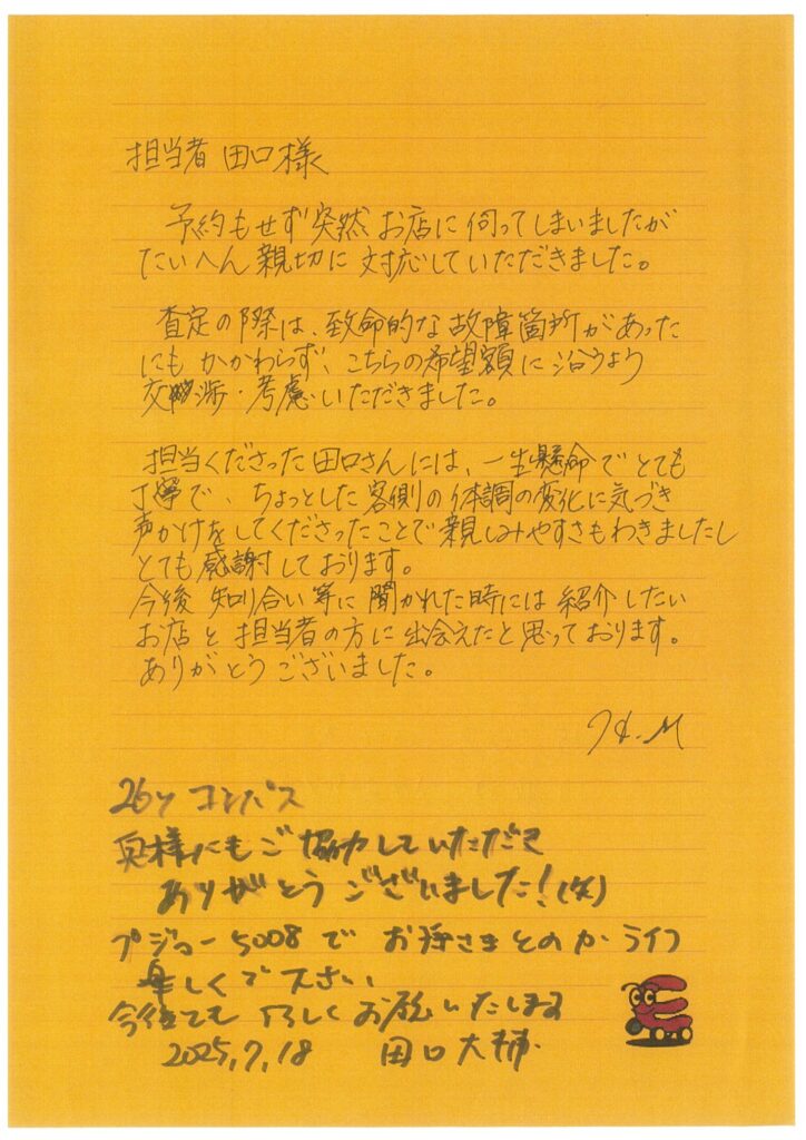 お客様のお手紙2025年12月4日H26年式 ジープコンパス
